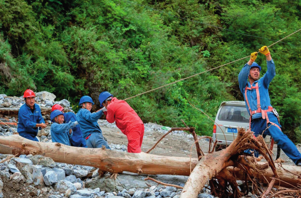 国网陇南供电公司电力抢修队在甘肃省陇南市武都区三河镇花椒沟进行抢修(2024 年 8 月摄) 国网陇南供电公司电力抢修队供图