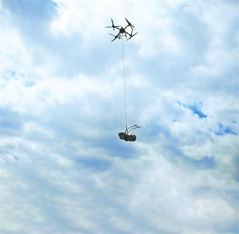 无人机吊运农具。