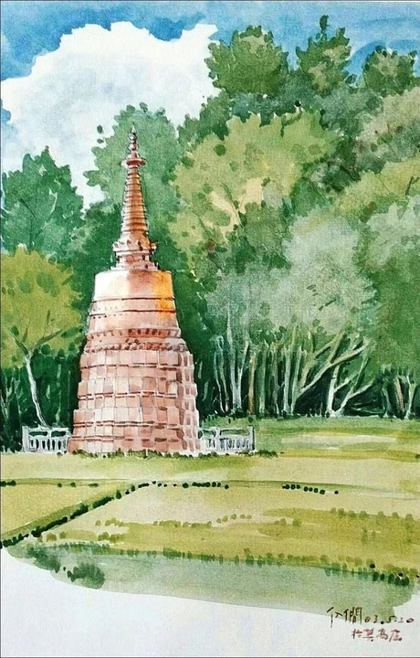 孙儒僴绘制的莫高窟一景。受访者供图